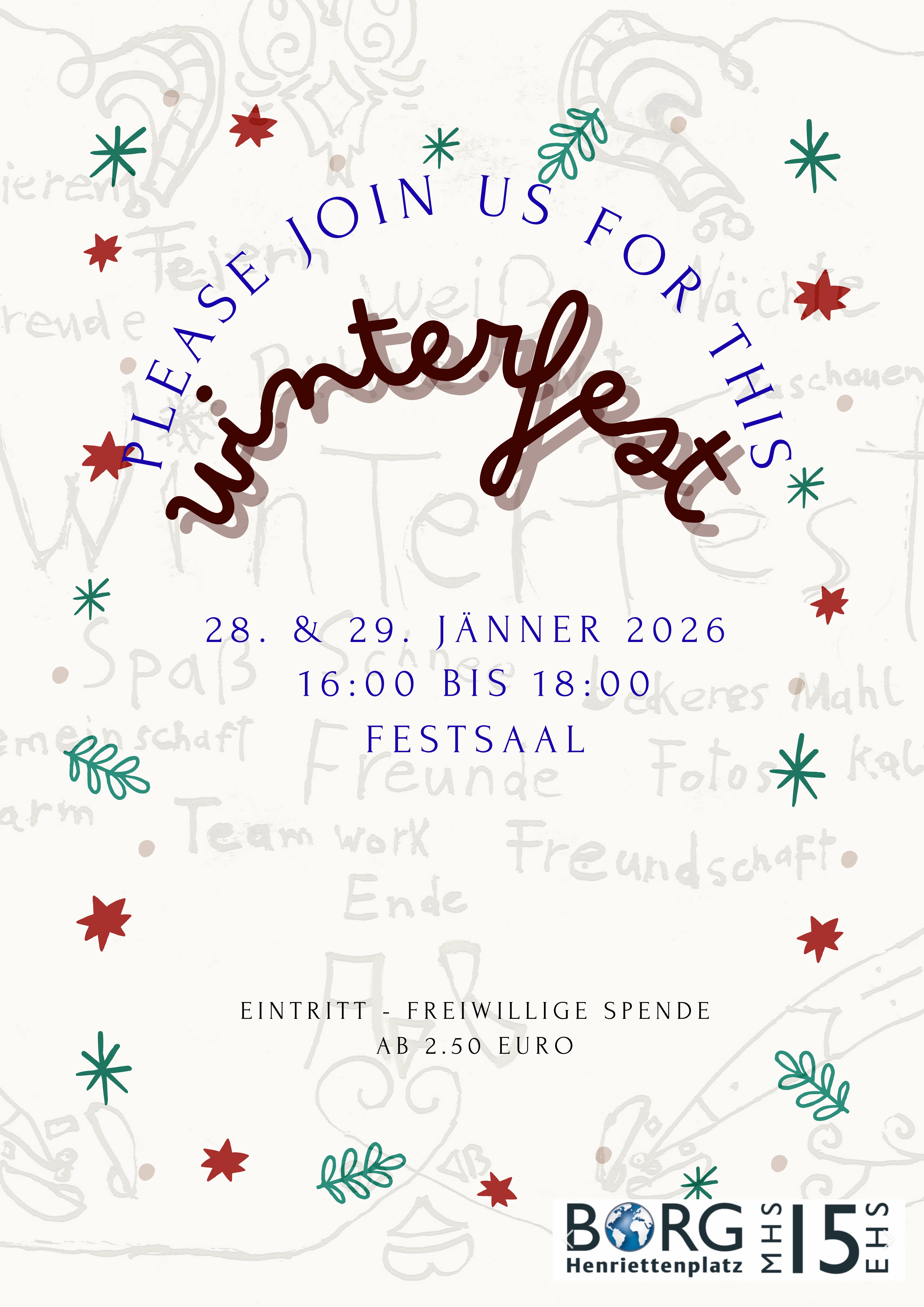 Am Mittwoch, den 28. Jänner und Donnerstag, den 29. Jänner 2026 findet unser Winterfest im Festsaal der Schule statt. Einlass ist ab 15:45h wir starten um 16:00h.
